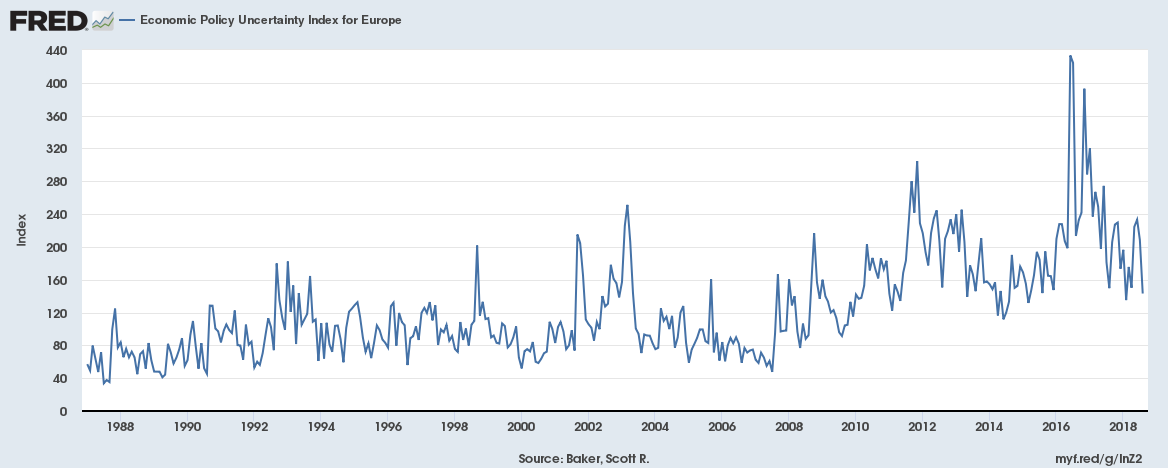 Hace unos días vimos el gráfico de incertidumbre en política económica para EE.UU. Hoy traemos el mismo gráfico para Europa. En EE.UU el dato estaba muy cerca a los mínimos históricos, en Europa, sin tener lecturas extremas de incertidumbre, si que podemos apreciar que no tenemos la misma confianza.