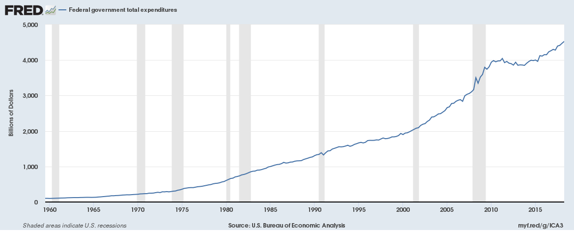 Gráfico del día.- Hoy toca hablar de gastos. En el gráfico tenemos la curva de gastos federales de EE.UU. No hay mucho que comentar, tras unos años de estabilización, desde el 2015 vemos como la curva se vuelve a «empinar». El gasto está disparado y esto solo es sostenible con una mayor recaudación impositiva dado el elevado volumen de endeudamiento que tiene el país.