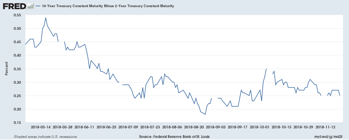 Una lectura sobre este diferencial que sea creciente, mostrará una buena marcha de la economía, mientras que un diferencial decreciente nos avisa de problemas. Pero el aviso de serias dificultades se produce cuando el diferencial se vuelve negativo, es decir cuando los rendimientos de las notas de corto plazo es mayor que el rendimiento de los bonos a mayor plazo. Es lo que se conoce como la inversión de la curva de tipos.