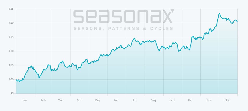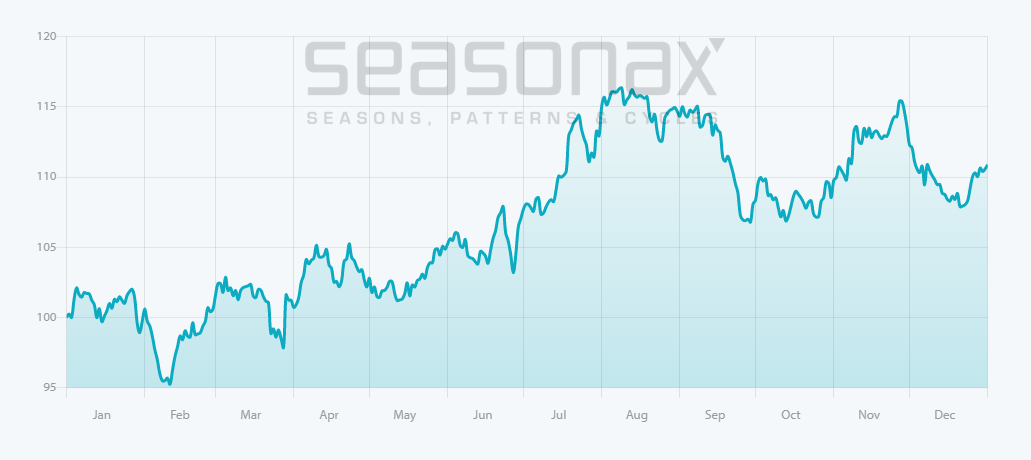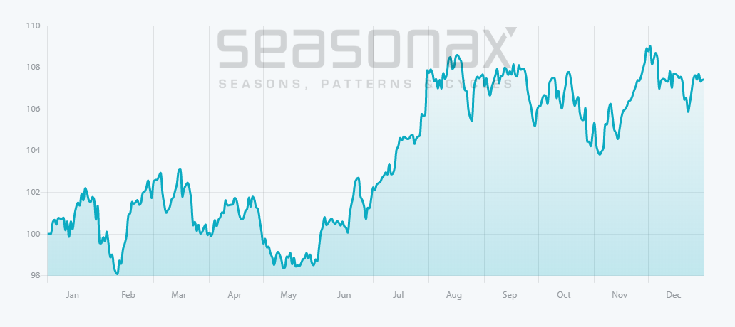 Hay tres valores claramente destacados, VERTEX, AMGEN y UNITED HEALTH, lo recomendable sería esperar alguna corrección para intentar una incorporación, veamos según los patrones estacionales ofrecidos por SEASONAX qué podríamos esperar en las próximas fechas: