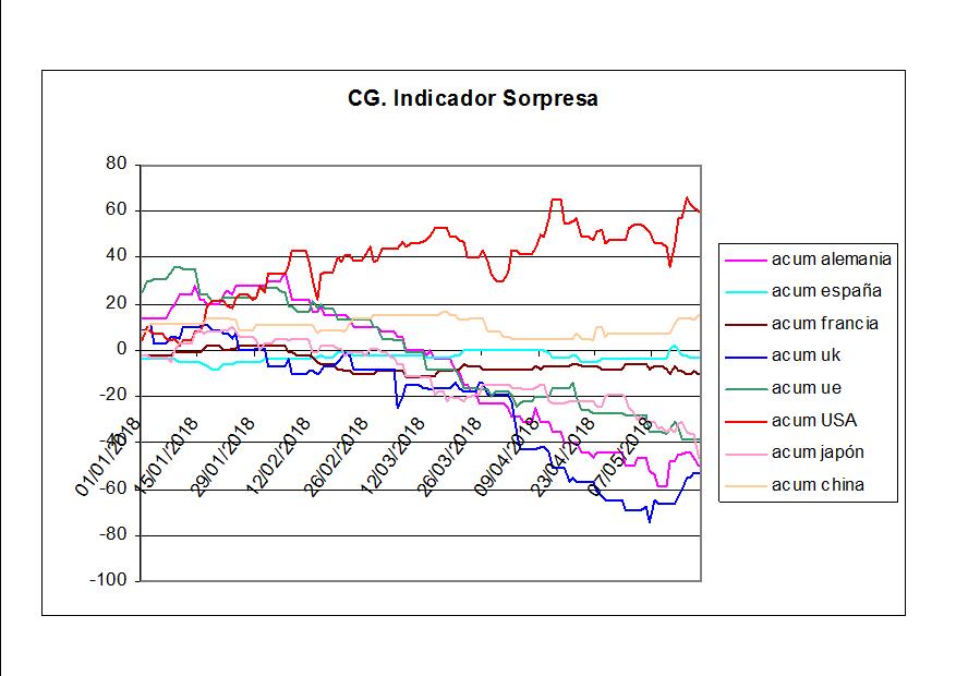 Indicador CG Sorpresa durante la semana del 4 al 8 de junio de 2018. Publicado por Julio Fdezel 11 junio, 201811:15:26.- Semana beneficiosa para UK y pésima para Japón. Alemania sigue mal y EEUU continua muy fuerte. España continua su tendencia plana desde que comenzó el año, lo cual indica que es una economía muy predecible.Seguir leyendoArtículo anterior Indicador sorpresas hasta 01/06/2018Artículo siguiente Indicador sorpresas semana 22 al 29 de junio.
