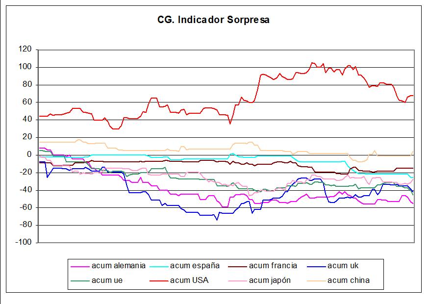 Esta vez si que hemos tenido una sorpresa importante: EE.UU ha sufrido una caida bastante severa, los datos publicados durante el mes han sido por lo general peores que los pronosticados por el consenso de analistas. Aún así, es la única economía de las analizadas que se mantiene claramente por encima del nivel cero.