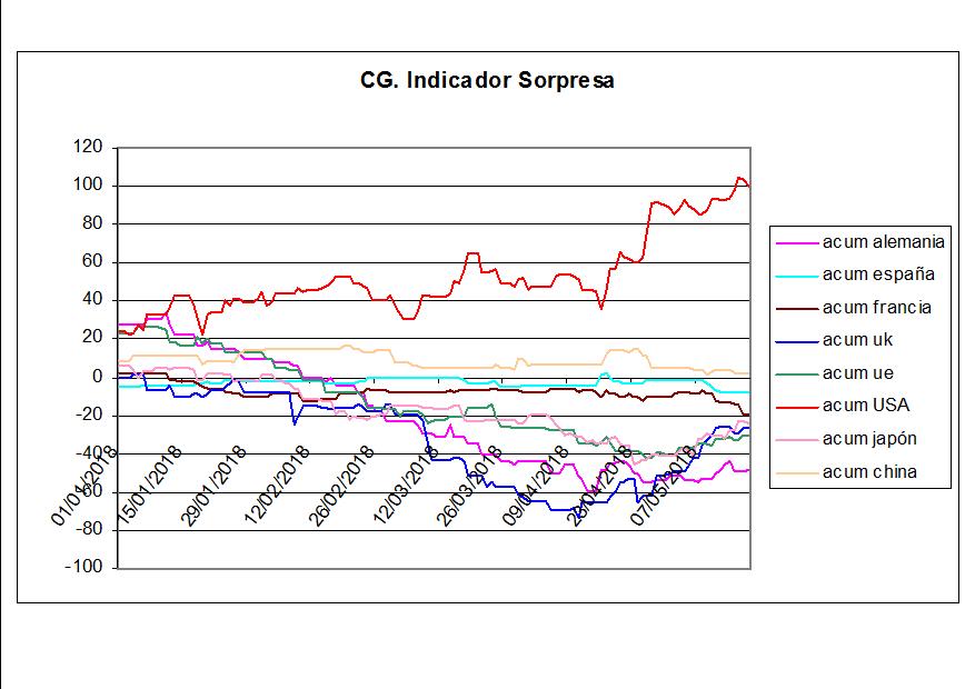 Dados los escasos movimientos producidos en las últimas semanas en nuestro indicador de sorpresas macro, tomamos la decisión de tomar el dato de forma quincenal. En estos quince días hemos visto una mejora en las economías que estaban más rezagadas: Reino Unido ya venía avisando hace semanas del mejor comportamiento de su economia, Alemania se ha sumado a este optimismo y ha presentado en su conjunto datos mejor de lo esperado. Sin embargo, España, que había permanecido en la «zona 0» durante todo el año (sin sorpresas) se ha metido en terreno negativo justo en el momento en que vemos una mejoria global. De Francia podemos decir lo mismo.