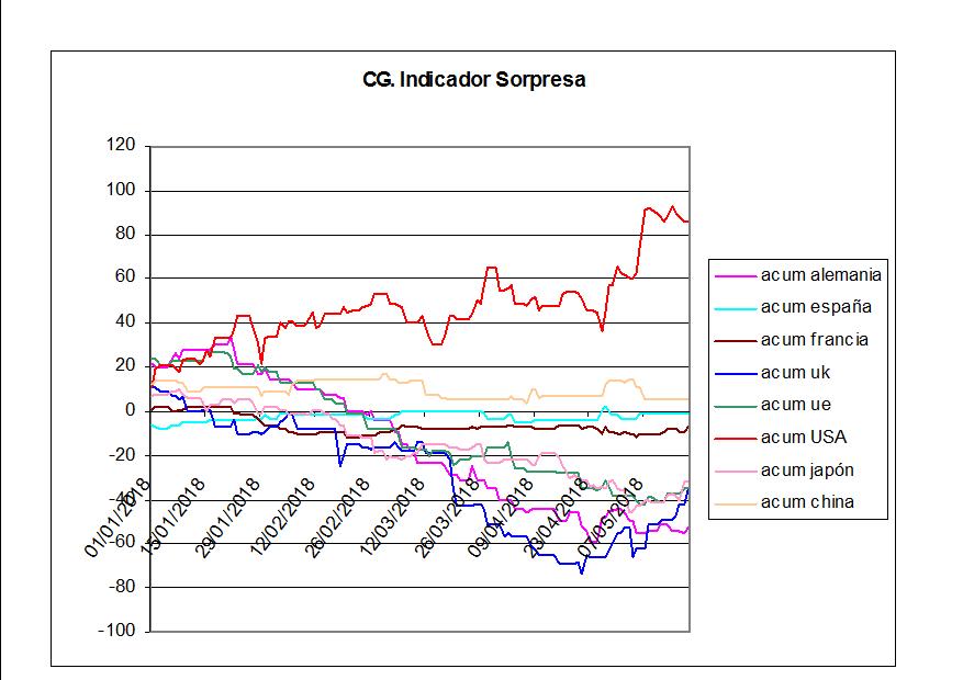 Indicador sorpresas semana 22 al 29 de junio. Publicado por Julio Fdezel 29 junio, 2018Reino Unido confirma durante esta semana la buena marcha que ha tenido durante el mes de junio. El resto sin cambios de relevancia.Seguir leyendoArtículo anterior Indicador CG Sorpresa durante la semana del 4 al 8 de junio de 2018.Artículo siguiente Iniciamos cobertura de tipo de cambio para la cartera Ópera.
