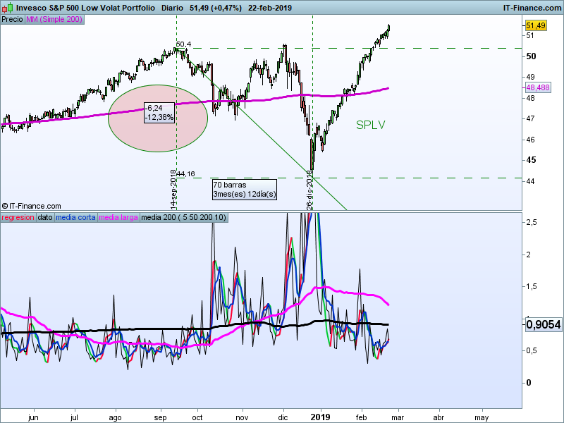 Hace ya unos días que el SPLV se situó en zona de máximos históricos, superando en cuanto a estructura se refiere a su homólogo SPY tal y como podemos ver en el gráfico.
