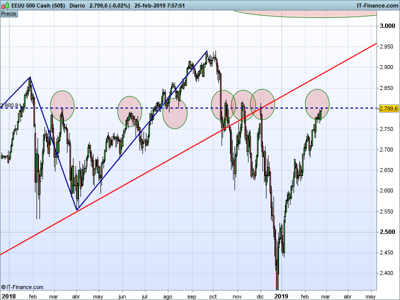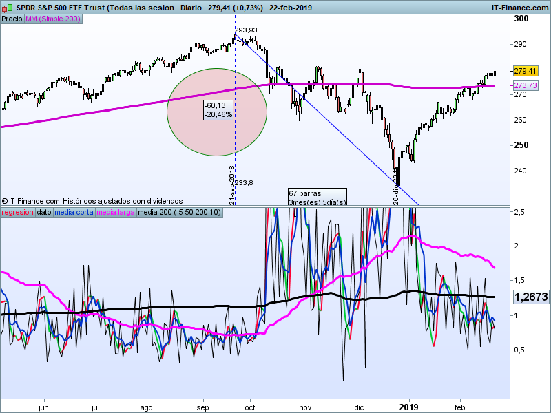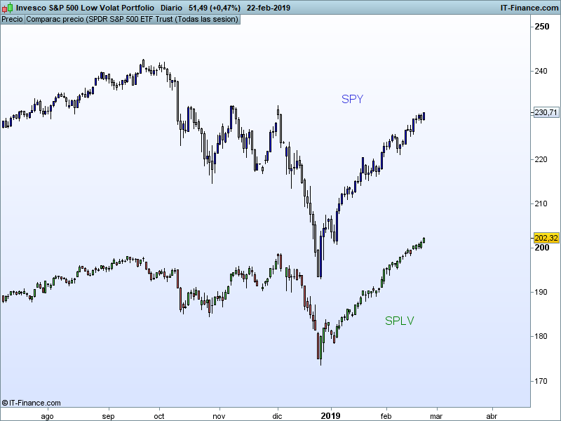 Si bien es cierto que en cuanto a rentabilidad están muy parejos con ligera ventaja para el SPY en 2019 (11.72% frente a 11.55% del SPLV), la diferencia estructural es muy evidente. El SPLV campa a sus anchas en zonas de máximos históricos frente al SPY (SP500) que se enfrenta en estos momentos a su nivel más relevante del último año, tal y como podemos ver en el gráfico siguiente: