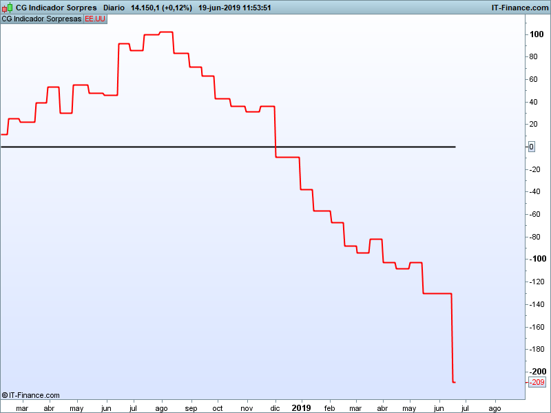 Ayer publicamos nuestro indicador de sorpresas que compara los datos macroeconómicos publicados respecto a lo que el consenso de analistas espera de ellos. Hemos aislado a EE.UU para que se vea de forma más clara, aquí tienen el resultado actualizado a la primera quincena de junio.