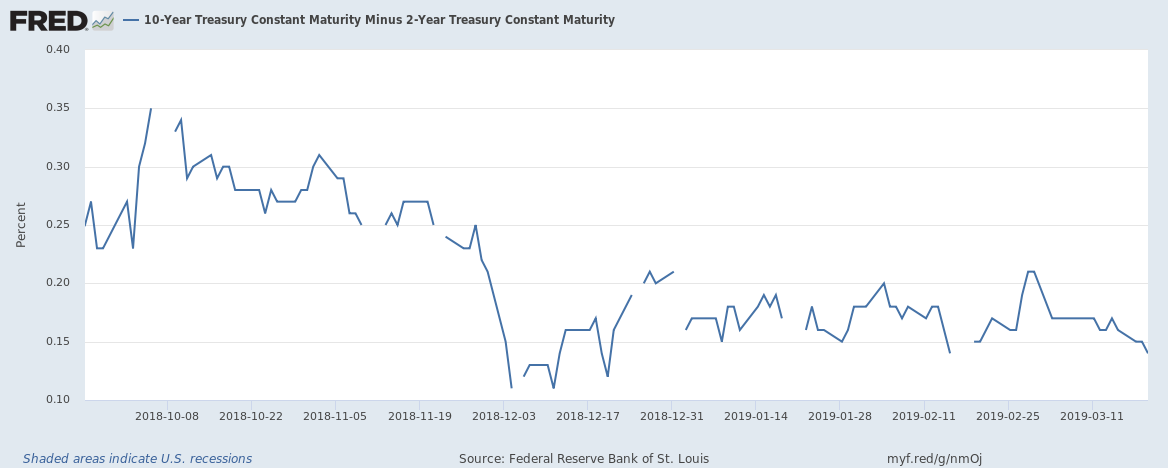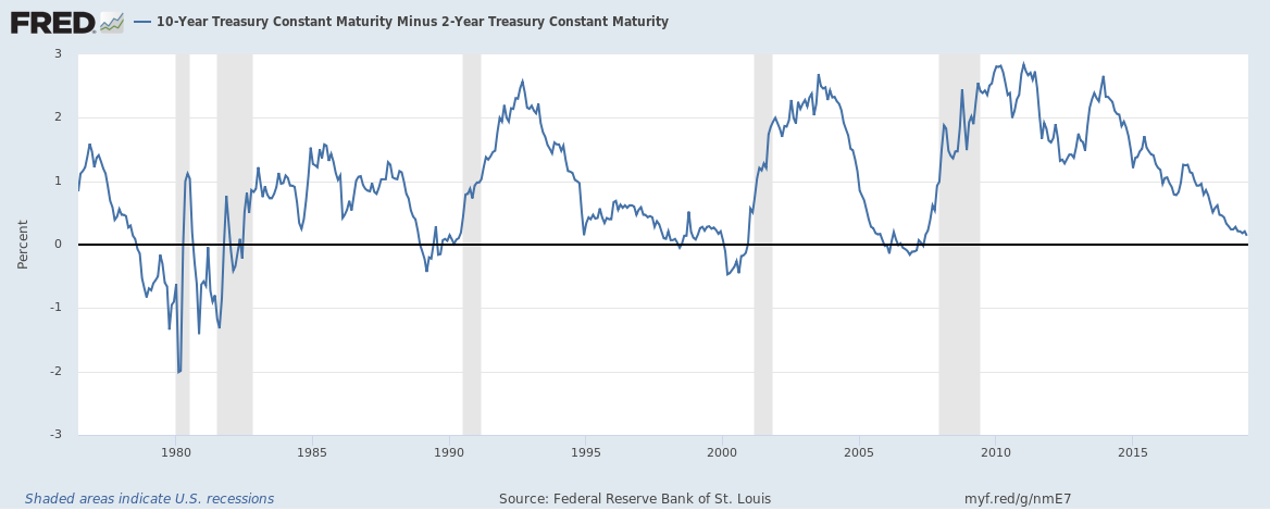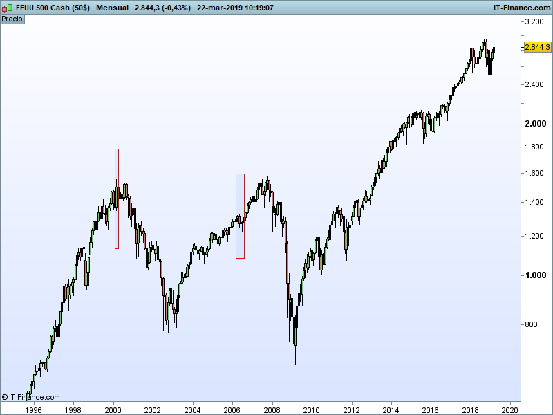Este gráfico mensual nos da una idea del miedo que le tiene el mercado a la inversión de la curva de tipos, aunque como vemos en estos dos casos recientes, la inversión no llevó al cataclismo de una forma inmediata.