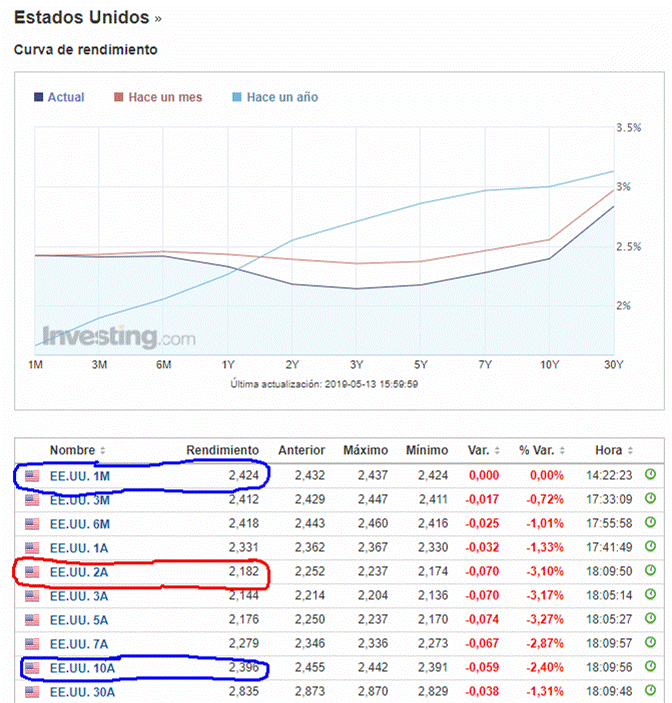 Vean como la curva de tipos en el día de hoy se ha vuelto a invertir completamente entre el periodo de pagarés a 1 mes y bonos a 10 años (en azul). Las notas a 2 años (rentabilidad en rojo) la están sujetando para que no quede invertida en el famoso plazo 2-10y.