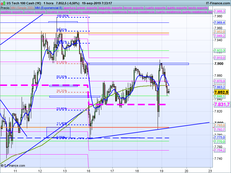Si bajamos a gráficos de H1, podemos observar con mayor detalle el movimiento, no solo de ayer, si no de la semana en curso que se inició con test al precio de apertura trimestral (PAT) en 7775. La clave para adoptar predisposición operativa durante esta semana es el precio de apertura semanal, mientras estemos por encima del 7832 deberíamos seguir manteniendo predisposición alcista, ahora bien el latigazo alcista que vimos tras tocar el SOR anual 7793 nos llevó al 61.8% de retroceso del tramo bajista que se inició el pasado día 12 y que terminó en el PAT. Cierres horarios por debajo de la apertura semanal incrementan bastante la probabilidad de que veamos una continuidad bajista a corto plazo. Como decíamos al inicio, habrá que ver la reacción del precio tras el vencimiento de derivados del viernes.