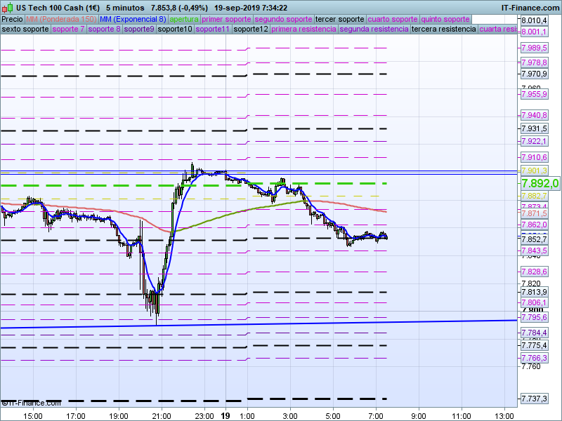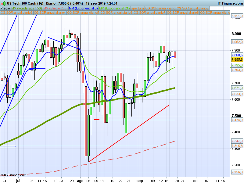 En gráfico diario vimos como la semana pasada encontramos resistencia en el SOR de categoria anual 7952, en ese punto tuvimos un giro que nos llevó, con la crisis de ARAMCO, a testear el SOR anual que teníamos a continuación por abajo, en 7793 para rebotar y dejarnos como solemos decir en tierra de nadie. La vela que tuvimos ayer es muy gráfica respecto a donde están sujetando el precio, de nuevo toque casi milimétrico al SOR 7793 para volver al precio de apertura diario. Lo que si es cierto es que en ningún momento la estructura alcista ha sufrido, se siguen manteniendo los mínimos crecientes y el rechazo en 7793 nos hace pensar como opción más probable volver a intentar el asalto a los máximos históricos. Solo un cierre diario claro por debajo de 7793 nos haría cambiar de predisposición.
