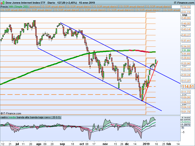 FAANG (FDN).- Mientras estemos por encima del SOR 123.10 mantendremos la predisposición alcista para buscar la media de 200 sesiones solapada con el SOR 131.69