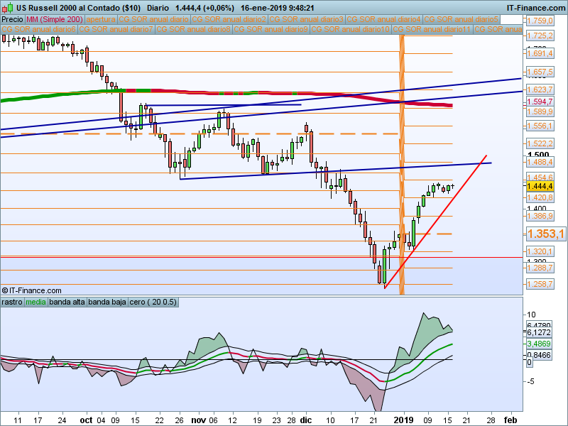 Small&Med Cap (Russell2000).- Durante lo poco que llevamos de año, este índice se ha mostrado más fuerte que el resto de Wall Street (sp500, DJI, Nasdaq), superando de forma amplia el segundo SOR alcista y muy cerca del tercero . El SOR 1454.6 es zona de relevancia significativa, por lo que deberíamos prestar especial atención en caso de perforar la línea trazada en rojo.