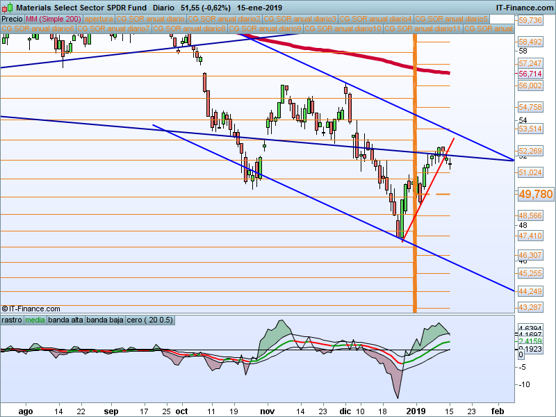 Materiales (XLB).- Alcanzamos el SOR 52.269 y hemos tenido rechazo, perforando la LT trazada en rojo. Con cierres por encima del SOR señalado, podríamos retomar el camino hasta la media de 200 sesiones. Cierres por debajo del SOR 51.024 nos predisponen a volver al PAA.