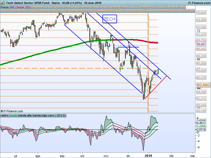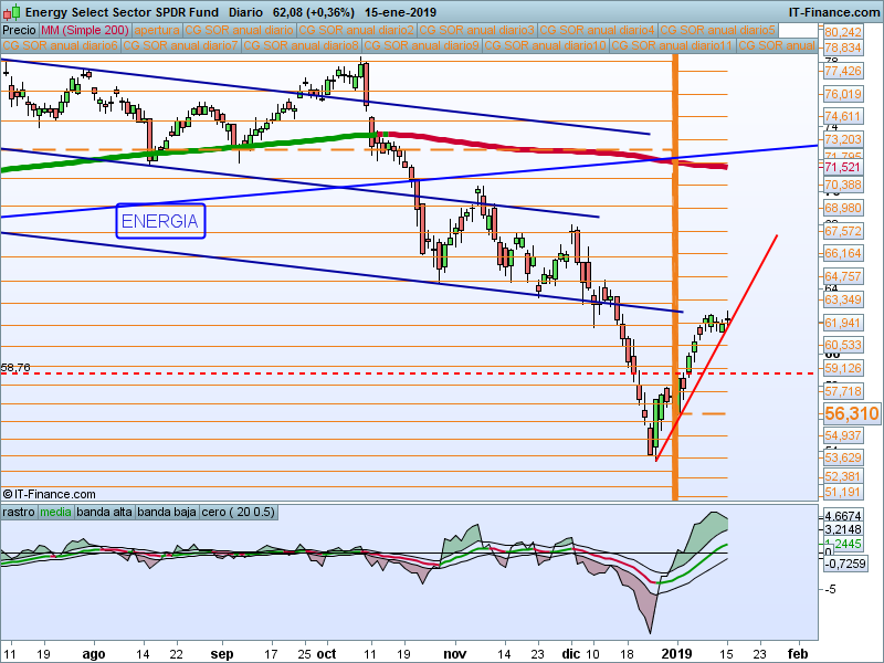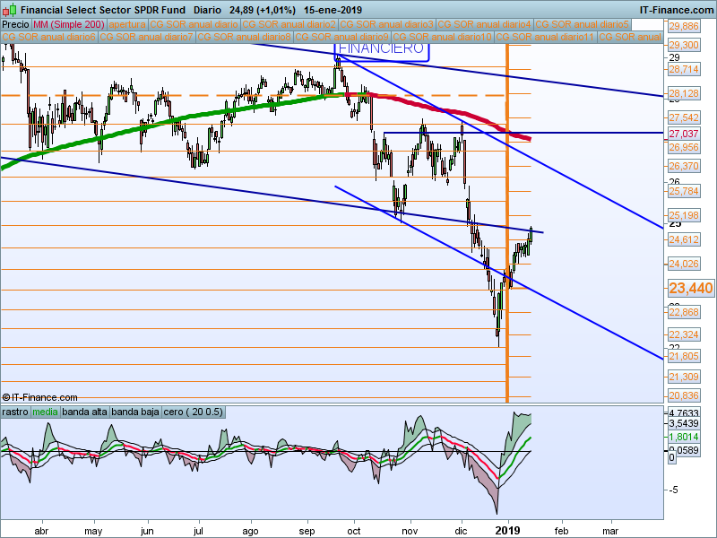 Financiero (XLF).- Toque a la base del canal bajista de 2018. La mano fuerte parece seguir apoyando el recorrido, mientras estemos por encima del SOR 24.61 seguimos manteniendo predisposición.