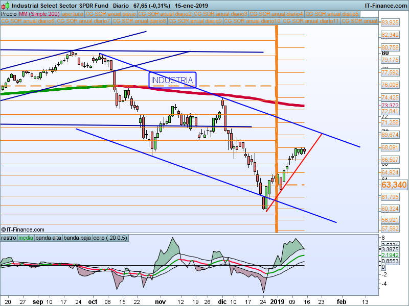 Industrial (XLI).- Por cuarto día consecutivo el SOR 68.091 impide el paso de la cotización. Nos queda para llegar a la parte superior del canal y más aún a la media de 200 sesiones. Mientras permanezca por encima del SOR 66.507 seguiremos manteniendo predisposición alcista.