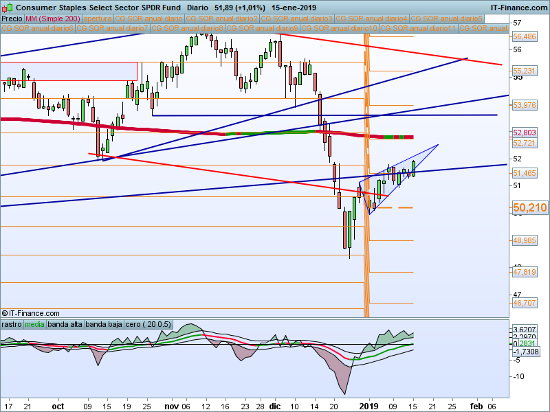 Consumo básico (XLP).- En este punto y una vez alcanzado el SOR 51.46, la opción más probable es la de alcanzar el SOR 52.72 con solape en la media de 200 sesiones. La pérdida del 51.46 con cierre por debajo nos podría indicar final de corrección.