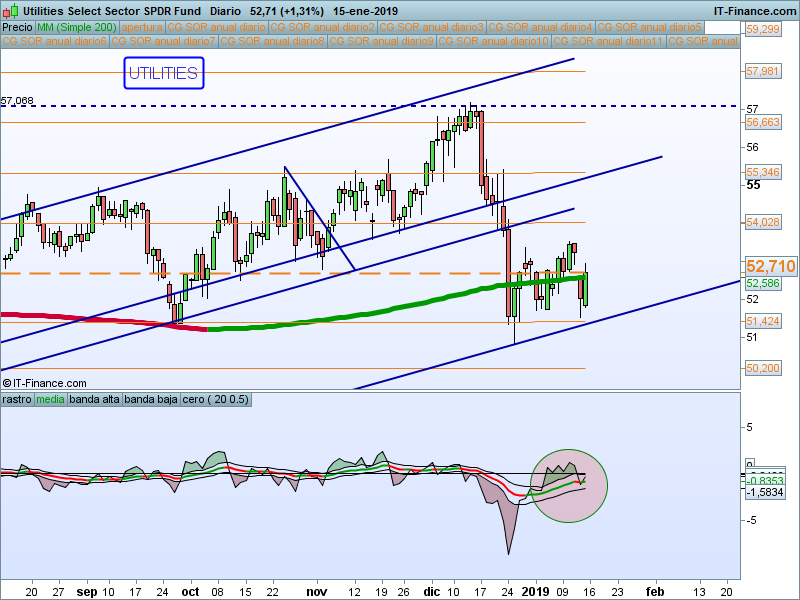 Utilities (XLU).- Ayer cerró en el Precio de apertura anual (PAA). Estamos enredados en la media de 200 sesiones y nuestro indicador de mano fuerte ha pasado a neutral . Mientras tengamos al resto de sectores tirando al alza, quizás tengamos que dejar este en un segundo plano.
