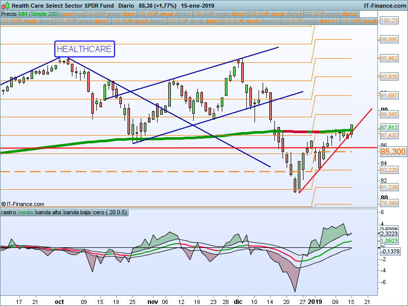 Healthcare(XLV).- En estos momentos estamos ligeramente por encima de la media de 200 sesiones, en el SOR 89.56 tenemos un nivel de resistencia significativa. Mientras estemos por encima del SOR 87.43, podemos esperar que llegue a tal resistencia. Los cierres por debajo de 87.43 tendrán connotaciones bajistas por la relevancia de la zona.