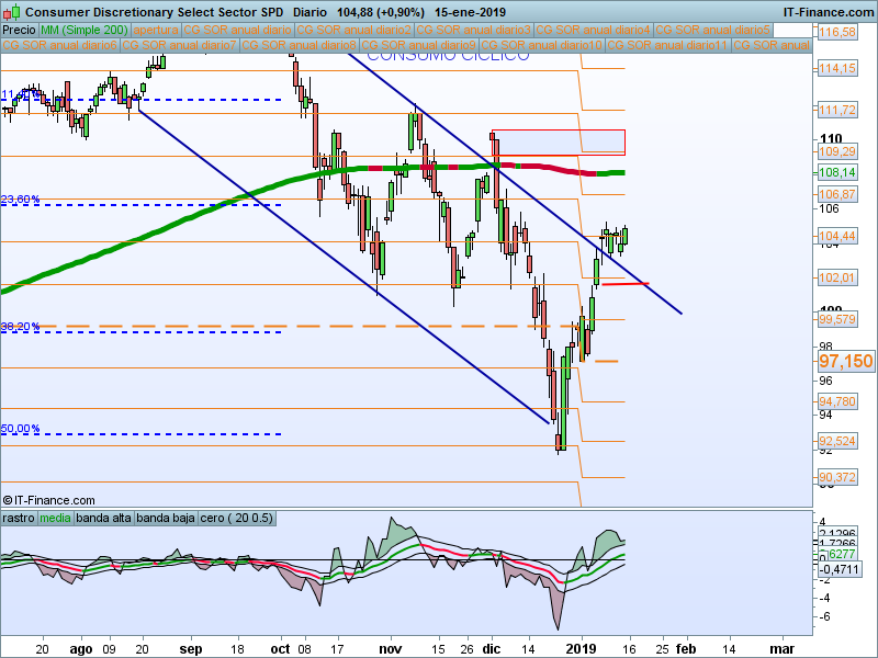 Consumo cíclico (XLY).- Alcanzamos el primer objetivo en la parte alta del canal y de momento estamos pegados al SOR 104.44. Mientras permanezcamos por encima del SOR 102.01 mantendremos la predisposición alcista.