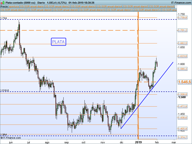 Nos incorporamos de nuevo al superar el precio de apertura anual en un día de mucha volatilidad. Mientras permanezcamos por encima del SOR 1585 mantendremos la predisposición alcista, teniendo en cuenta que estamos dentro de una onda 5.