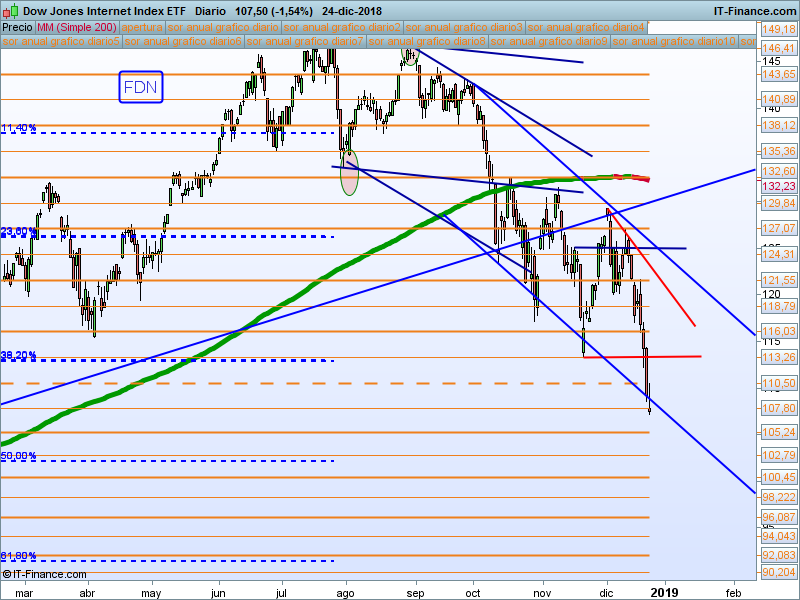 FAANG (FDN).- Perdimos el precio de apertura anual. El nivel a recuperar con cierre por encima debería ser el 116.03.