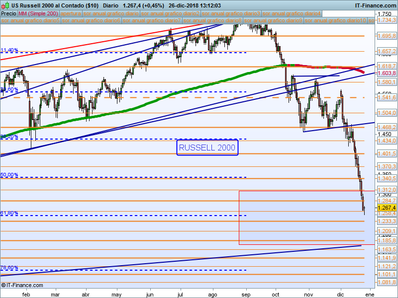 Small&Med Cap (russell2000).- Hemos llegado al retroceso 61.8 del impulso iniciado en 2016. Habrá que pedirle un cierre por encima del SOR 1340 para confirmar la formación de un suelo a corto plazo.