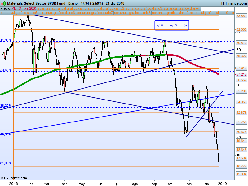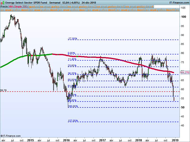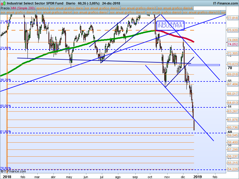 Energia (XLE).- Ha ido perdiendo todos los niveles uno por uno. La claridad con la que ha perdido el 61.8 hace muy probable la vuelta a mínimos de 2016. No nos interesa.