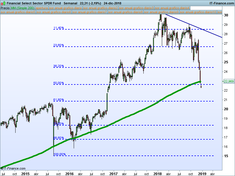Financiero (XLF).- Lo cierto es que una vez perdido el 50% de retroceso tiene un gran vacío de precios hasta el 61.8%. Mientras esté por debajo del SOR anual 23.40 no pensaremos en buscar el rebote.
