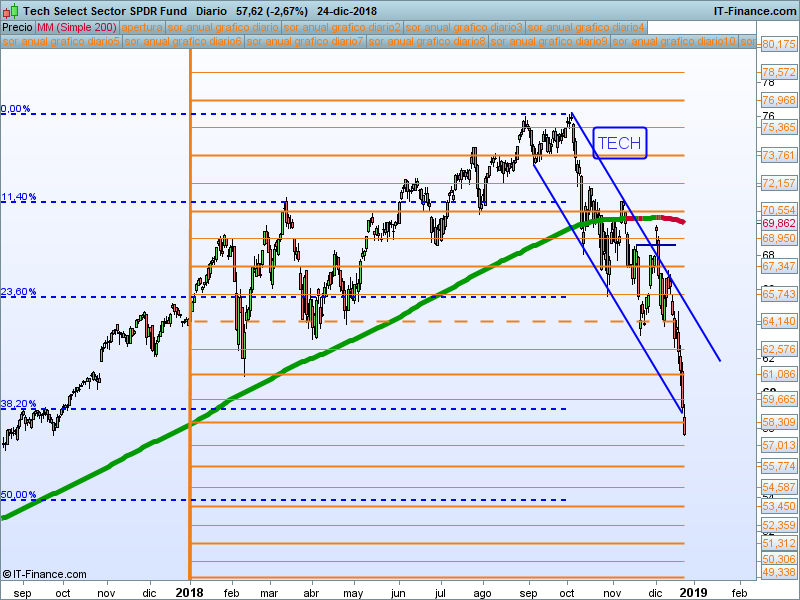 Tech (XLK).- El lunes se perforó la base del canal con cierre en mínimos. Estamos en la zona del 38.2 de retroceso del impulso alcista iniciado en 2015. Una vela semanal con cierre por encima de este nivel nos podría avisar del rebote.