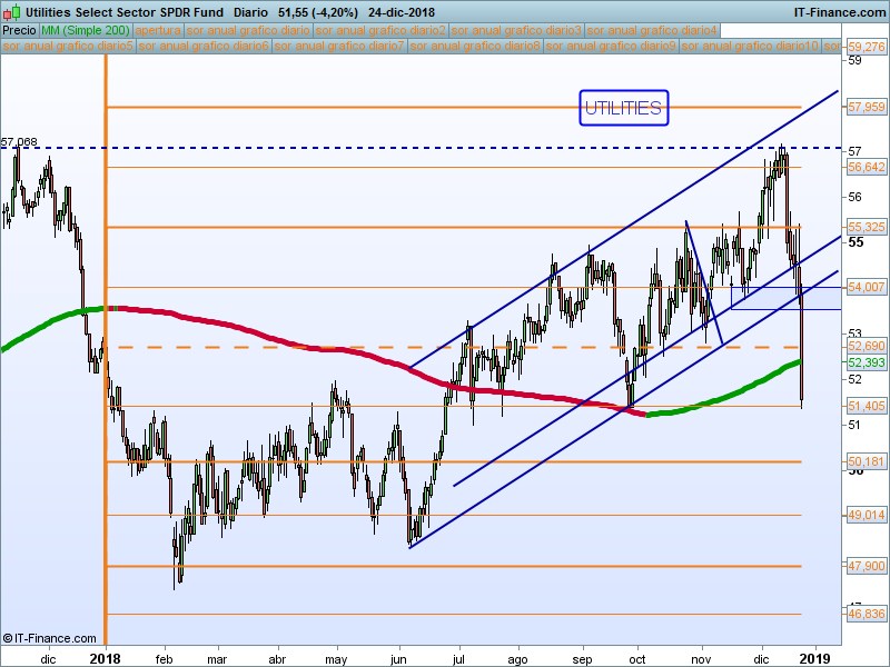 Utilities (XLU).- Los máximos históricos se le han atragantado a este sector, hace unas semanas lo comentamos en el vídeo que dedicamos al sectorial (lo pueden ver en este enlace ) en donde decíamos que la estructura que estaba formando el impulso no nos terminaba de gustar. La vela del pasado lunes 24 es demoledora con un rango de un 8% perdiendo la media de 200 sesiones. Mientras estemos por debajo del SOR 54.007 nos mantendremos alejados.