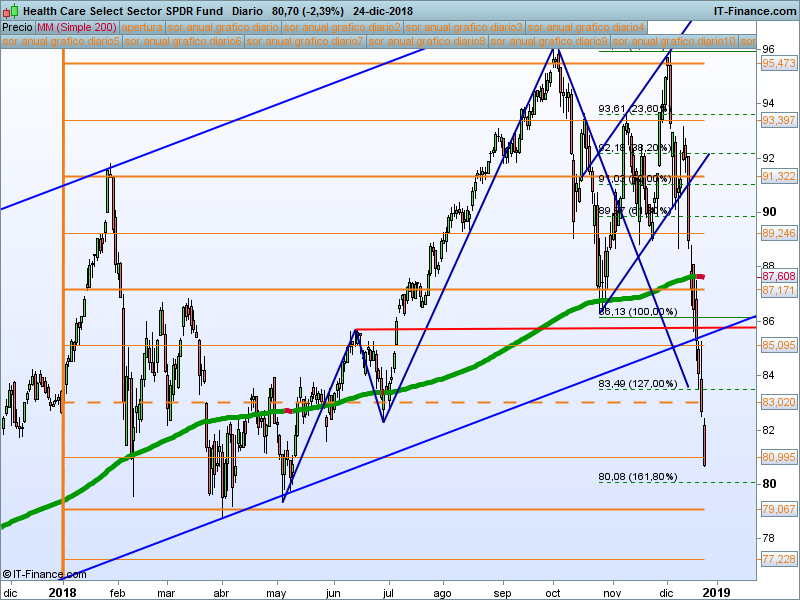 Healthcare(XLV).- Podemos esperar un rebote en el SOR 79.06, zona de mínimos del 2018. Este rebote nos puede llevar a testear la media de 200 sesiones. Hay que esperar validaciones y patrones de giro.
