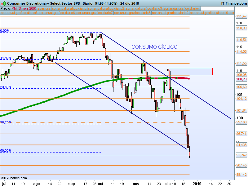Consumo cíclico (XLY).- Mismo planteamiento que en Tech, estamos en la parte baja del canal en la zona de retroceso del 50%. Interesante ver cierres por encima del SOR 94.43