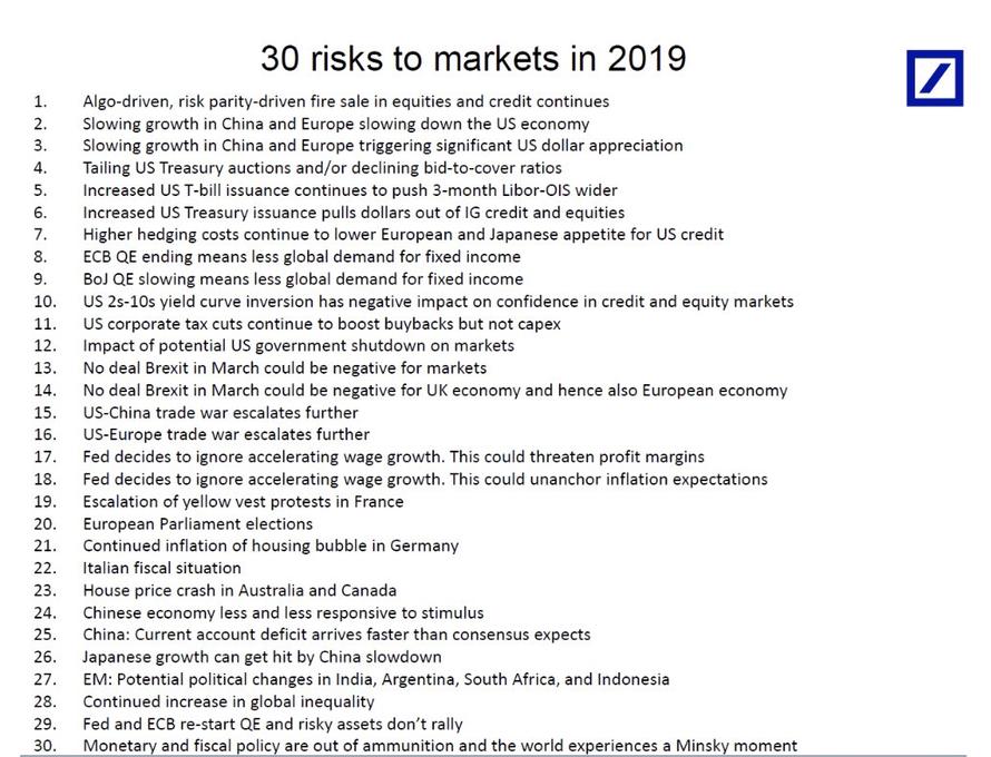 Los 30 riesgos que tendrán los mercados según Deutsche Bank. Publicado por Julio Fdezel 27 diciembre, 201827 diciembre, 2018 Seguir leyendoArtículo anterior Inyección de 64.000 millones de dólares.Artículo siguiente Proyecciones de crecimiento para 2019