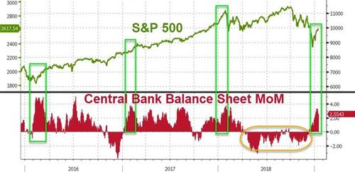 Los balances de los bancos centrales aumentan en Enero. Publicado por Julio Fdezel 17 enero, 201917 enero, 2019Lo leemos en la web zerohedge.com. A pesar de las políticas de ajuste y normalización, tal y como viene pasando en los últimos años, los balances incrementan su tamaño y de forma paralela las bolsas suben. Aquí les dejo el gráfico Seguir leyendoArtículo anterior Apertura de mercados 17/01/2019. Europa se queda sin baterías.Artículo siguiente Apertura de mercados 18/01/2019. Vuelta a 1987