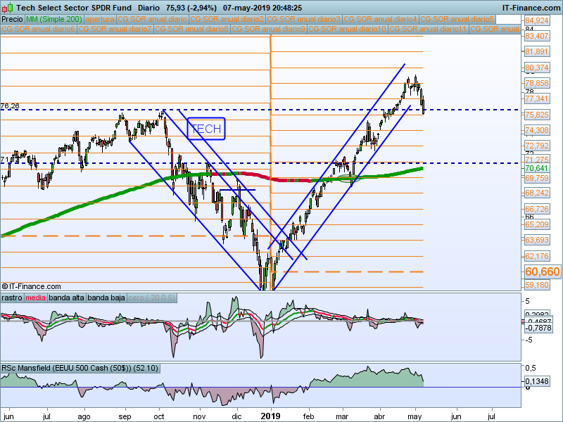 En el momento en el que escribimos estas líneas (martes 07/05/2019 a las 20.49) estamos justo en el SOR 75.82 y por debajo del anterior nivel de máximos marcados en octubre 2018. Cierres por debajo de este nivel nos confirma movimiento correctivo de mayor grado. En principio, si consideramos como escenario más probable un movimiento correctivo de el tramo alcista iniciado en diciembre, deberíamos ver correcciones hasta la media de 200 sesiones al menos.