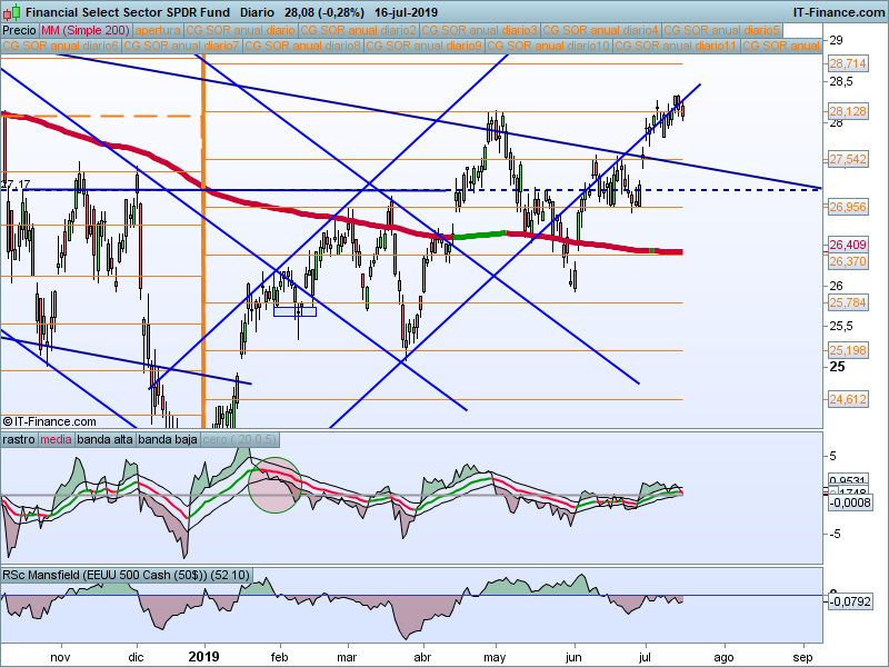 La presentación de resultados de los grandes ha coincidido con los máximos anuales del sector, sin embargo y pese a que los datos han mejorado previsiones parece que podamos estar asistiendo a un escape falso al alza. El siguiente nivel de soporte significativo lo encontramos en el SOR 27.54.