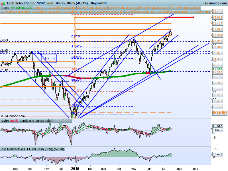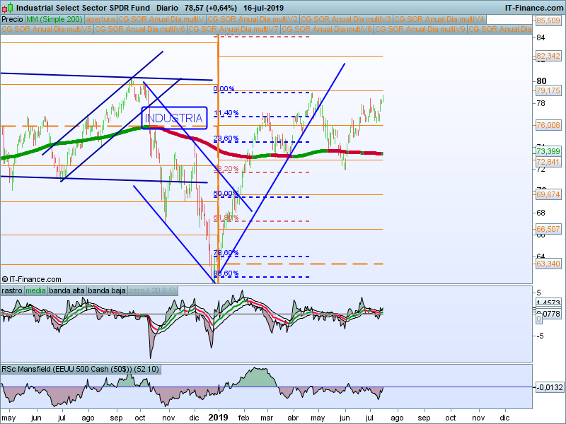 El comportamiento del sector industrial en las últimas sesiones está siendo bastante positivo, estamos a punto de alcanzar el máximo anual, por encima de este nivel tendremos el SOR 82.35 y el 85.50 como siguientes objetivos. Punto de reversión en 76.