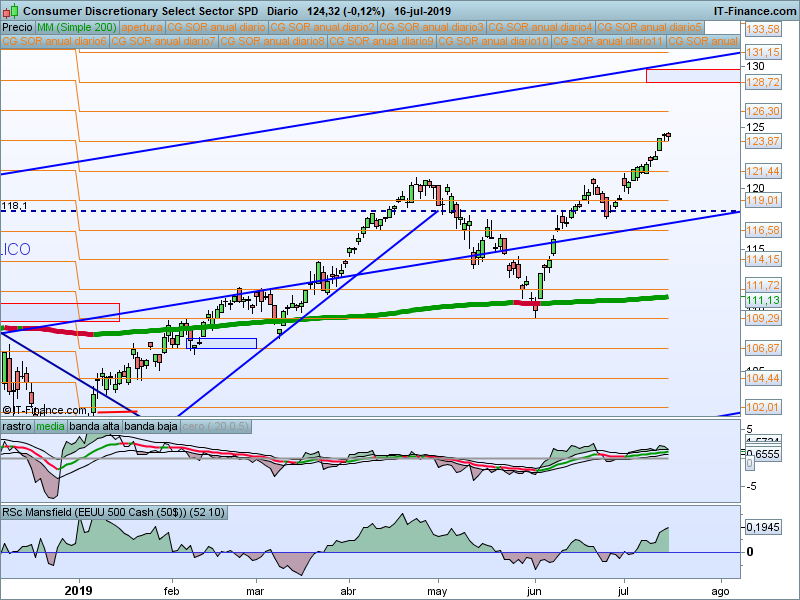 Puede que sea el sector con más fuerza en este momento. Vamos a elevar el punto de reversión al SOR 121.45, mientras estemos por encima de este nivel mantendremos la predisposición alcista.