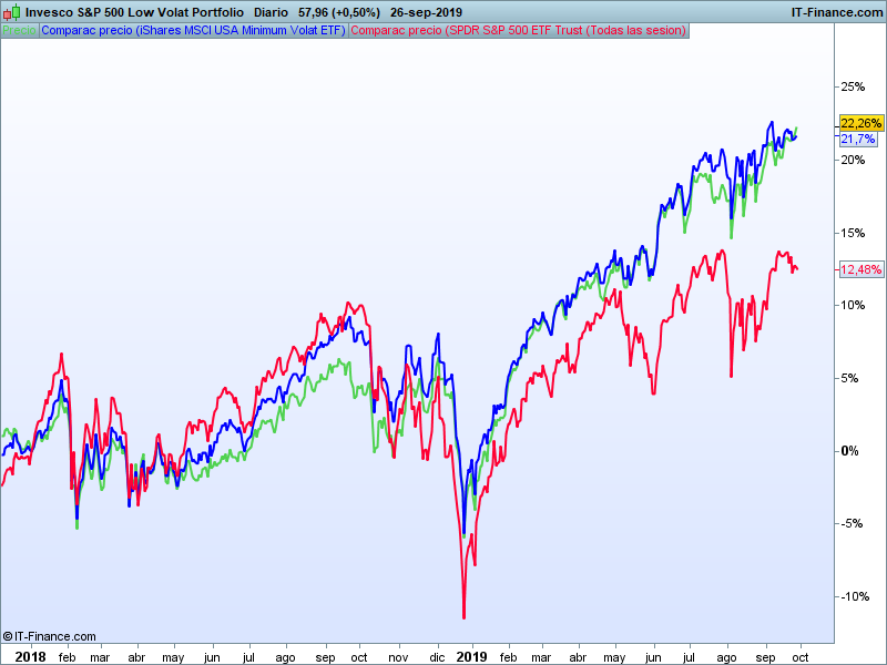 Ya hemos hablado en estas páginas de los ETFs de baja volatilidad. Hace unos días, coincidiendo con que el VIX superaba de nuevo el nivel de 16, comentábamos el comportamiento que estaba teniendo durante este año 2019 el SPLV (ETF de baja volatilidad) frente al SPY (ETF que replica al SP500).