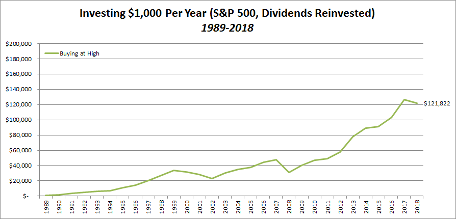 Este concepto es la base del análisis técnico. Yo siempre digo que quizás no sepa que es mejor comprar, pero intento saber cual es el mejor momento para hacerlo. Pues en este estudio que hacen comparan como habría evolucionado una cartera a lo largo de los años bajo el supuesto de tener una capacidad de compra de 1000$ por año.