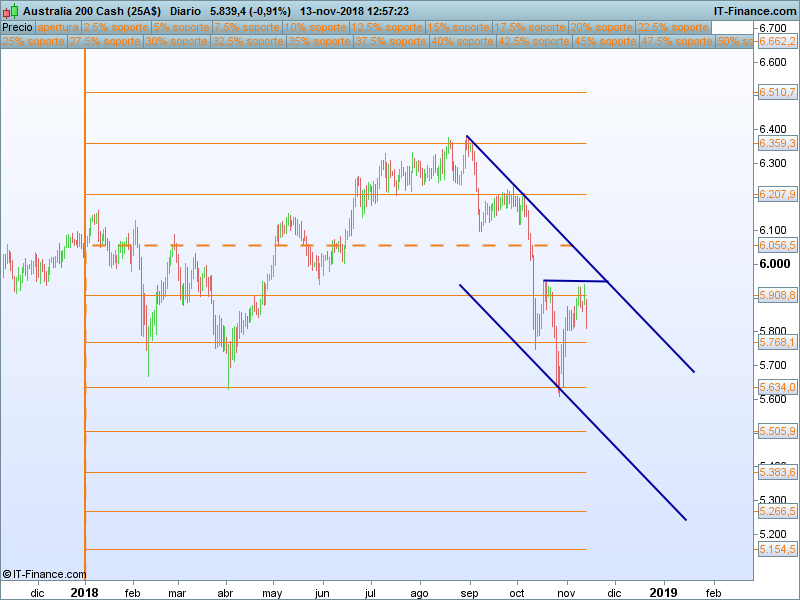 ASX (australia).- No hemos podido alcanzar la zona del anterior máximo relevante. En caso de cierre por encima del SOR 5908, la opción más probable es alcanzar de nuevo el PAA, cierres por debajo del SOR 5768 nos predisponen a buscar nuevos mínimos.