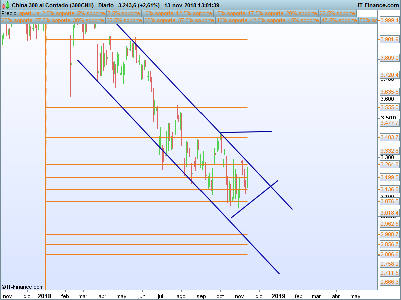 CSI 300 (China). Mientras permanezca por debajo del SOR 3403, la predisposición debe ser bajista/lateral, Cierres por debajo del SOR 3136 nos predisponen a buscar la base del canal y nuevos mínimos