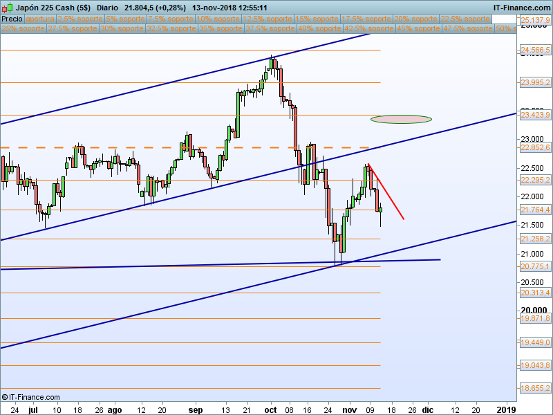 Asia.- En líneas generales, podemos apreciar como el rebote que hemos tenido a nivel global iniciado el 20 de octubre , en los mercados asiáticos se ha desarrollado con menos fuerza, lo que por otra parte es lógico atendiendo a la debilidad mostrada por China durante el año.