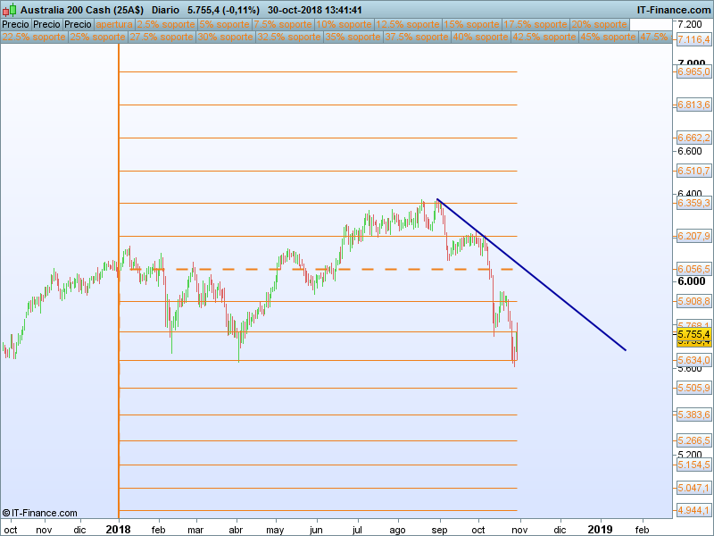 Australia 200.- Hemos ido a buscar los mínimos anuales u estamos en pleno rebote, la zona a vigilar es el SOR 5908. Mientras estemos por debajo, predisposición bajista.