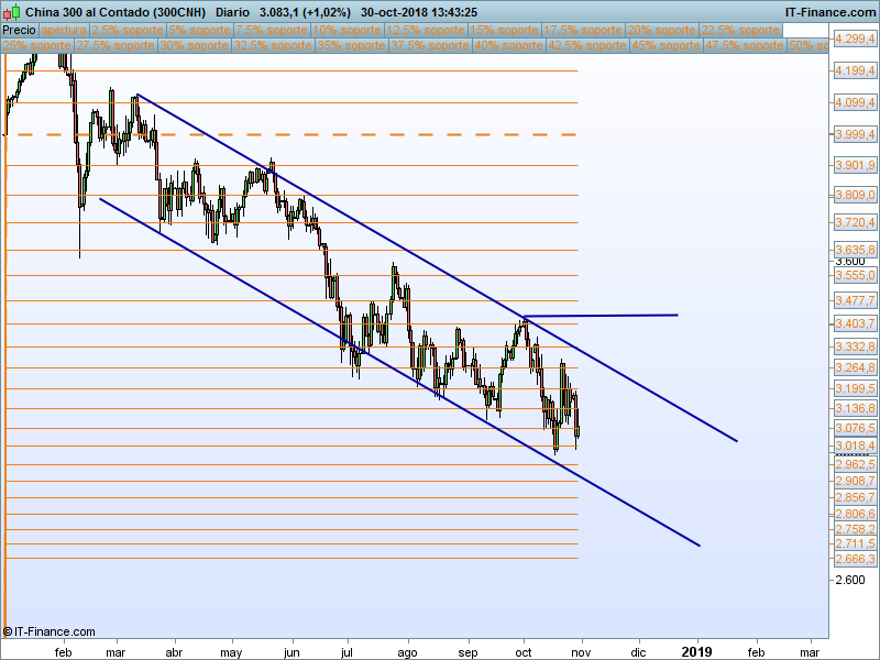CSI 300(china).- Parece que vamos a buscar de nuevo la parte baja del canal. Si esto ocurre veremos si el canal es perforado o si por el contrario encontramos soporte para rebotar.