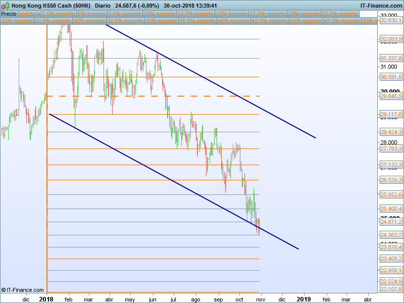 Hangseng.- Nos hemos quedado pegados a la base del canal. Un cierre por encima del SOR 25952 nos podría indicar el despliegue de un tramo al alza hasta la parte superior del canal.