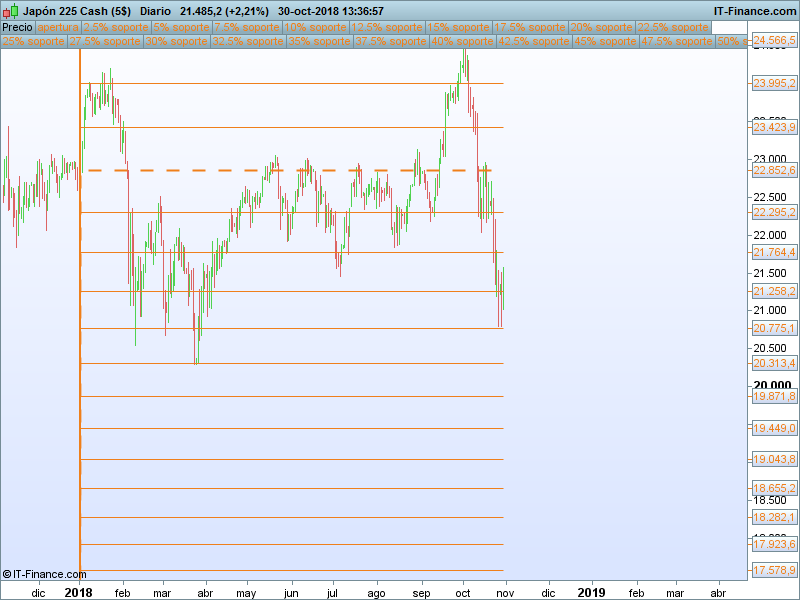 Nikkei. Doble toque al SOR 20775 e intento de rebote. Mientras no tengamos un cierre por encima del PAA, nuestra predisposición será bajista. Un nuevo mínimo mensual nos llevaría a visitar el mínimo anual.