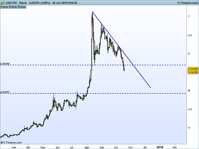 La lira turca continua una semana más recuperando posiciones respecto al US dólar. Se podría estar dibujando una pauta plana con lo que habría que ir vigilando la posible ruptura para el inicio de un nuevo tramo al alza.
