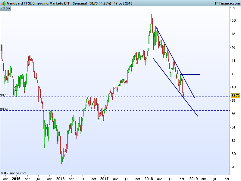Mercados emergentes.- Como cada semana, es el ETF VWO el que tomamos como referencia a la hora de analizar el comportamiento de los mercados emergentes. Finalmente no hubo perforación del soporte 38.55 y el precio se ha contenido en esa zona. Para nosotros este hecho no es condición suficiente para vaticinar un cambio de tendencia y adoptar predisposición alcista. Tal y como venimos comentando, solo en el caso que veamos un cierre por encima de la zona 42 podríamos prepararnos para buscar validaciones. Seguimos fuera.